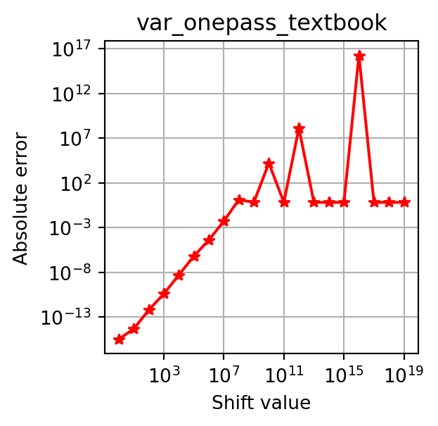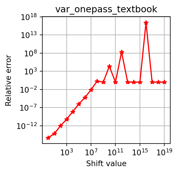So far, so good. But if we shift all values by a large constant, the one-pass version quickly breaks down due to cancellation errors: